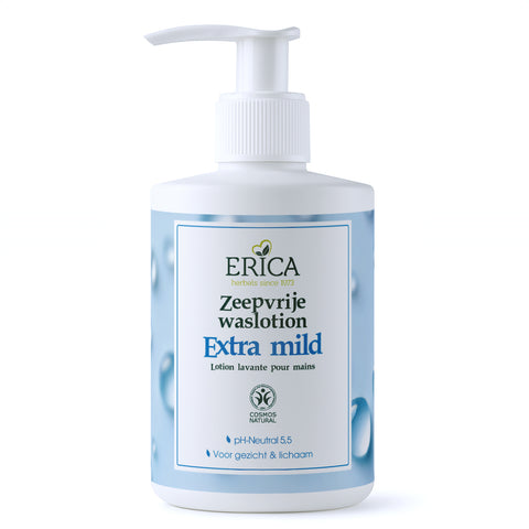 Erica waslotion is geschikt voor ieder huidtype. De waslotion is zeepvrij, parfumvrij, PH-neutraal en droogt de huid niet uit. Het pakt vuil, make-up resten en bacteriën effectief aan zonder de beschermingslaag van de huid aan te tasten. Het huidverzorgende melkserum in de waslotion beschermt de natuurlijke zuurgraad van de huid.