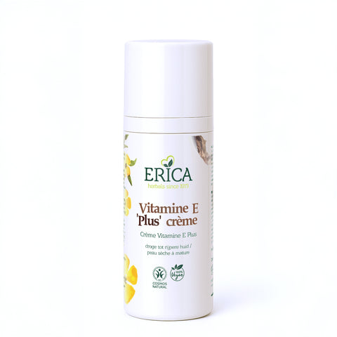 Erica Vitamine E Plus crème is zeer geschikt voor de droge en vochtarme huid heeft een verzorgende werking door jojobaolie, sheabutter en sesamolie en werkt verzachtend door de natuurlijke vitamine E en Zoethout extract. De crème beschermt de huid tegen invloeden van buitenaf en heeft een hydraterende werking.